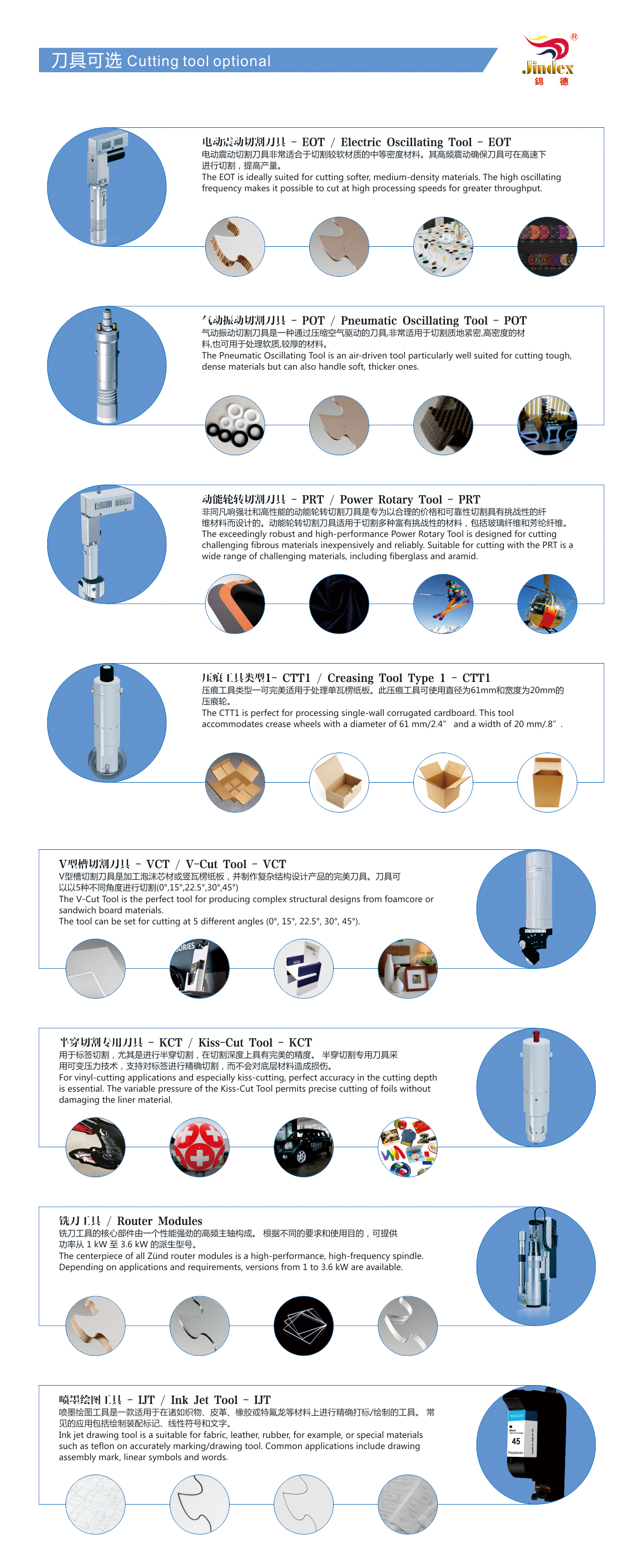 ◇ 配置振動(dòng)刀、拖刀,筆畫工具以及可選配置半刀,銑刀,開槽刀,圓刀、壓痕刀等多種刀具,可實(shí)現(xiàn)寫字畫線、虛線裁切、半斷裁切、全斷裁切、銑刀裁切、多種材料V-CUT開槽、開銑槽、大小壓輪壓痕、硬質(zhì)材料刮痕等實(shí)用功能。