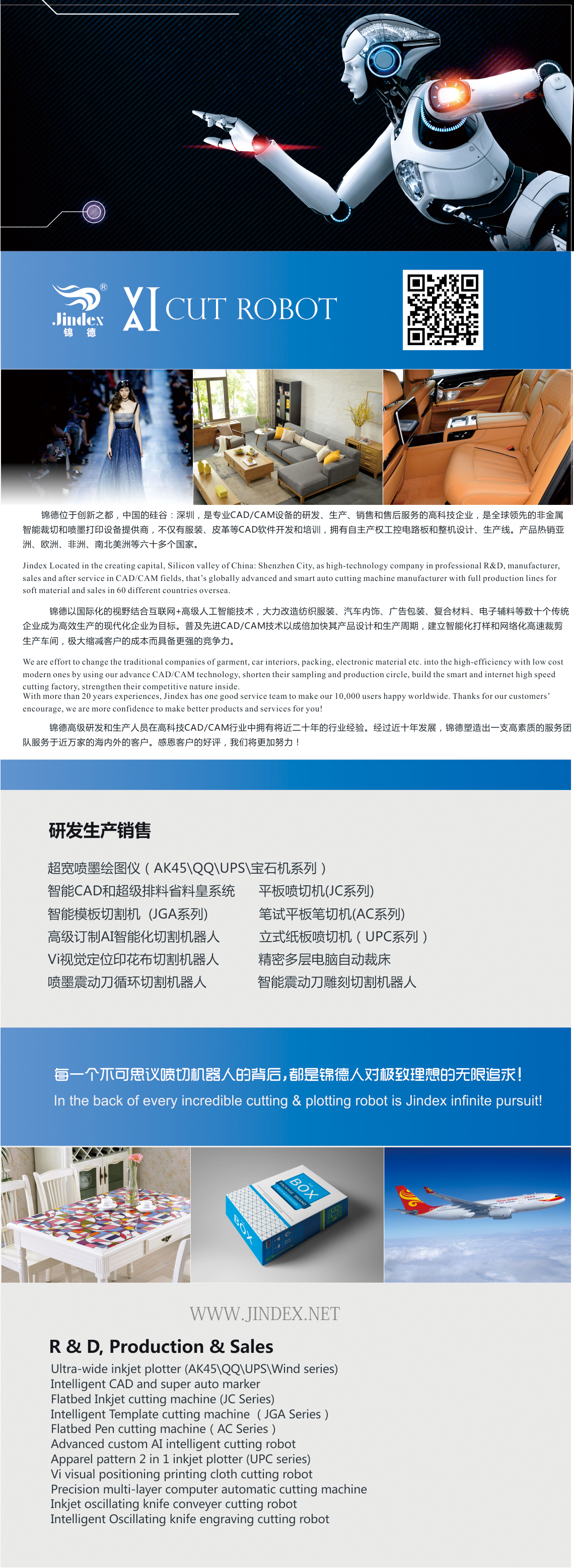 Any CAD software can be connected. It is widely used for plotting and cutting for the industries and sectors like garment, shoe making, cases, handbags, laser cutter molds plotting, lighting fixtures, advertising gifts, self-adhesive and color box packing.