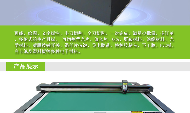 Cutting Material | Flexible circuit boards, shielding materials, insulating materials, optical materials, membrane button switches, pot buttons, conductive tape, special adhesive tape, stickers, PVC board, white cardboard and plastic plate,etc. | ||